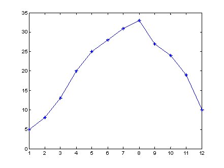 8、已知某地区1-12月份的平均气温为5,8,13,20,25,28,31,33,27,24,19,10,请绘图表示。