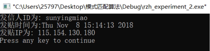 | int main() { int pos=1; int i=0; SString S; char ch; FILE *fp; int j=0; if((fp=fopen("C:\\Documents and Settings\\Administrator\\桌面\\rzh\\bbs.html","r"))==NULL) { printf("Open the file failure.\n"); exit(0); } while(j<MAXSTRLEN) { if((ch=fgetc(fp))!=EOF) { S[j]=ch; } j++; } fclose(fp); S[j]='\0'; char D[]={"发信人:"}; printf("发信人ID为:"); get_next(D,next); i=Index_KMP(S,D,pos); while(S[i]!='(') { printf("%c",S[i]); i++; } printf("\n"); pos=1; char M[]={"发信站: 兵马俑BBS ("}; printf("发贴时间为:"); get_next(M,next); i=Index_KMP(S,M,pos); while(S[i]!=')') { printf("%c",S[i]); i++; } printf("\n"); pos=1; char T[]={"FROM:"}; printf("发贴IP为:"); get_next(T,next); i=Index_KMP(S,T,pos); while(S[i]!=']') { printf("%c",S[i]); i++; } printf("\n");