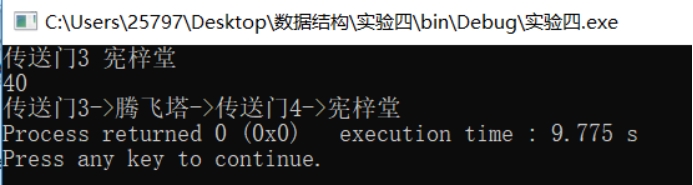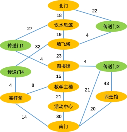 【输出样例】 74 北门->传送门3->腾飞塔->图书馆->传送门2->南门