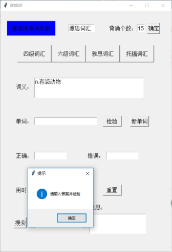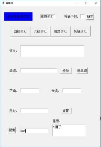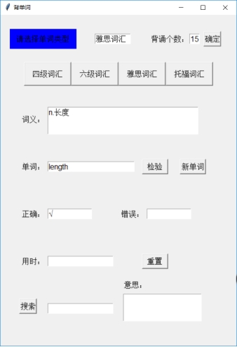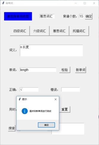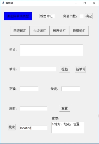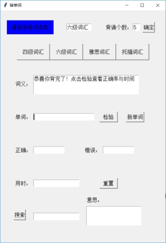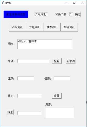 n=10 num=0 cor=wro=0 _new_=1 _test_=0 def load(file_name): data = xlrd.open_workbook(file_name) table = data.sheet_by_name('Sheet1') words=table.col(0, start_rowx=0, end_rowx=None) words=[x.value for x in words] meaning=table.col(1, start_rowx=0, end_rowx=None) meaning=[x.value for x in meaning] global wordlist wordlist=[[a,b] for a,b in zip(words,meaning)] t1.delete('1.0','end') t1.insert('insert',file_name[0:4]) def newword(): global word global _test_ global _new_ global num global time_start global time_end if num==0: t4.delete('1.0','end') time_start=time.time() if num<n: if _new_==1: word=random.choice(wordlist) t2.delete('1.0','end') t5.delete('1.0','end') t6.delete('1.0','end') e.delete(0,'end') t2.insert('insert',word[1]) _new_=0 _test_=1 else: showinfo(title='提示', message='请输入答案并检验') else: t2.delete('1.0','end') t5.delete('1.0','end') t6.delete('1.0','end') t2.insert('insert','恭喜你背完了!点击检验查看正确率与时间') e.delete(0,'end') time_end=time.time() _new_=0 _test_=1 def test(): global _new_ global _test_ global num global cor global wro global time_end if num<n : if _test_==1: var=e.get() if var==word[0]: t5.insert('insert','√') cor+=1 else: t6.insert('insert','×') s=str(word[0]) t5.insert('1.0',s) wro+=1 num+=1 _new_=1 _test_=0 else: showinfo(title='提示', message='请点击新单词进行测试') else: t2.delete('1.0','end') t5.delete('1.0','end') t6.delete('1.0','end') t5.insert('insert',str(cor)) t6.insert('insert',str(wro)) t2.insert('insert','请点击新单词开始下一轮背诵') t4.insert('insert',str(time_end-time_start)[0:6]+'秒') _new_=1 _test_=0 num=cor=wro=0