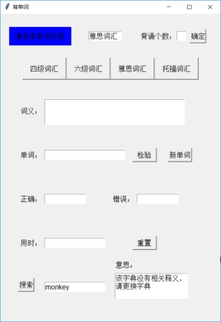 def search(): key=e3.get() t8.delete('1.0','end') flag=0 for x in wordlist: if x[0]==key: t8.insert('1.0',x[1]) flag=1 if flag==1: pass else: t8.insert('1.0','该字典没有相关释义,请更换字典')