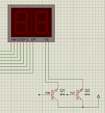 我采用的是7SEG-MPX2-CA型两位数字显示的数码管,可以显示0~99一共100个数字,由ABCDEFG DP八个输入控制,其电位分别由单片机的P3.0~P3.7接出,并行受到单片机的控制。1,2端分别接Q1,Q2两个晶体管和电源作为驱动。两个晶体管的控制信号分别由单片机的P2.6、P2.7口接出。在与老师的交流中我了解到,虽然仿真时不接驱动也可以实现,但是在实际操作中,外加驱动是必不可少的,单片机只能提供控制信号,而数码管的能量要靠驱动获得。