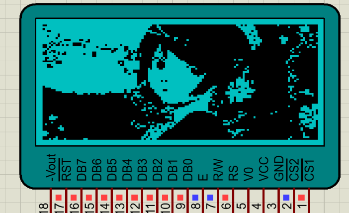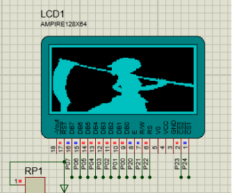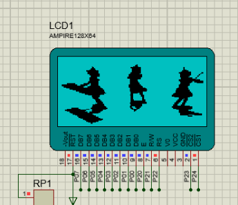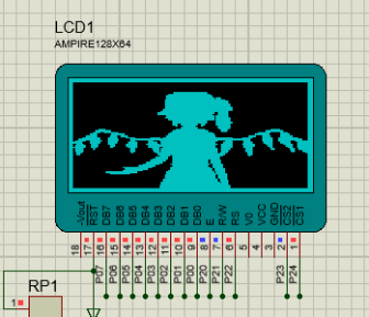 Lcd 显示屏由128x64个像素组成,型号为AMPIRE128x64。Lcd显示屏的8,7,6,2,1口分别接单片机的P2.0~P2.4口;9~16口分别接单片机的P1.0~P1.7口;17口接电源。由单片机产生并行信号把图片显示在屏幕上,经过设定显示的内容、延时等等,就可以实现动画效果。
