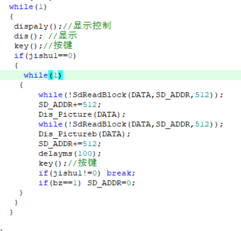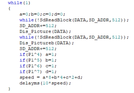 主要利用了计时当中key()函数中全局变量jishu、bz的变化,在播放动画时,若键盘有输入,jishu的值也会变化,此时通过条件语句判断,如果jishu不为0,跳出循环(暂停)。若bz为1,播放动画的帧序号变量SD_ADDR置零,实现重复播放。 播放动画部分 主要函数为dispicture、dispictureb、SdReadBlock 作用分别是:显示LCD上半部分、显示LCD下半部分、读取SD卡文件。 其中SdReadBlock函数在文件SD.c中,SD.c为从网上搜索的读取SD卡方法的例程,在研究清楚其具体作用后,我将它放入了自己的工程中,并进行了调用。