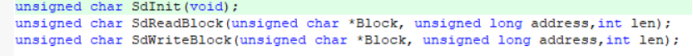 1 2 3 unsigned char SdInit (void ) ;unsigned char SdReadBlock (unsigned char *Block, unsigned long address,int len) ;unsigned char SdWriteBlock (unsigned char *Block, unsigned long address,int len) ;