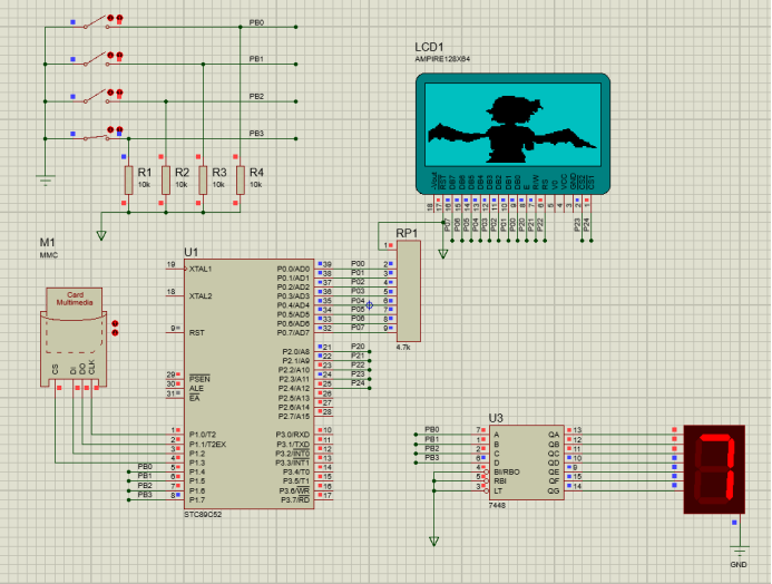 PB0~PB3分别接单片机的P1.4~P1.7和7448的7、1、2、6口,输入的是需要延时的BCD码。