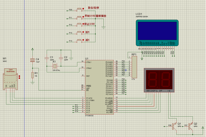 电路中最重要的器件,本实验中采用AT89C52单片机,其中引脚与外部的连接在前面已经介绍,在本例中的主要作用是依据键盘输入的信号,控制数码管和lcd显示屏输出内容。包括开始计时、暂停计时、计时数增减、暂停播放视频、从头播放视频等等。其中MMC、键盘、时钟是输入信号,lcd、数码管是输出设备。