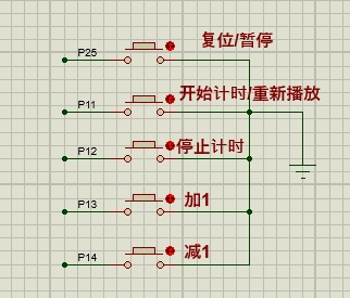 键盘用五个可复位按键开关组成,分别用于实现倒计时复位/视频暂停、倒计时开始/视频重新播放、停止计时、计时加一、计时减一的功能。其中第一个按键接单片机的P2.5口,第二~第五分别接单片机的P1.4~P1.7口,用于输入控制信号。