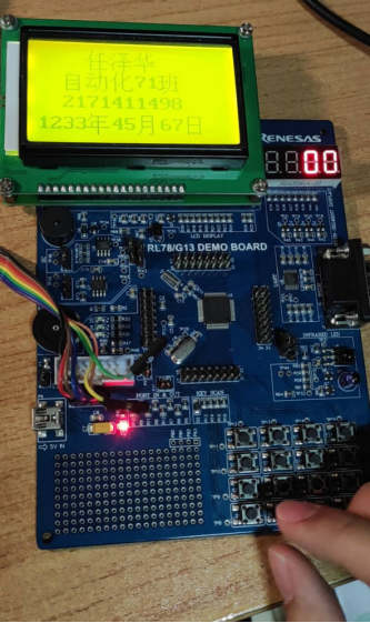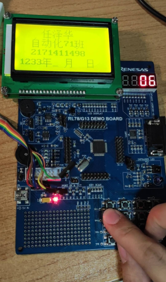 voidmain(void) { hdwinit(); R_PCLBUZ0_Create(); R_TAU0_Create(); R_TAU0_Channel0_Start(); R_MAIN_UserInit(); lcd_init(); num_keyboard=0; /* Start user code. Do not edit comment generated here */ while (1U) { lcd_display(0," 任泽华 " " 自动化71班 " " 2171411498 "); lcd_display(48,date); Keyboard_scan(); if(num_keyboard==14){sflag=1;} if(sflag==1)num_10 = num/10; else {num=0;num_10=0;} if(bflag==0 && num_10==10){ R_PCLBUZ0_Start(); bflag=1; delaya();R_PCLBUZ0_Stop();} if(num_keyboard==13){bflag=0; num=0;num_keyboard=0;sflag=0;}