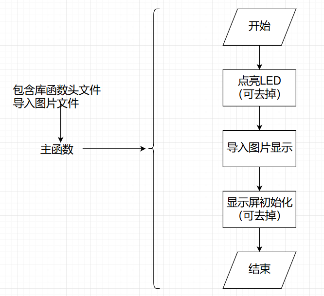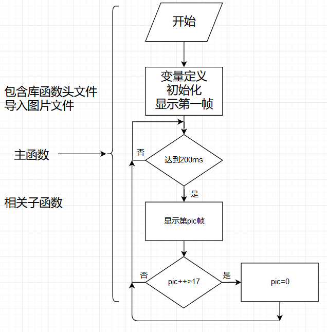 由于此任务为播放GIF图片,不需要键盘进行选择,所以不需要在中断中实现,在主函数当中用一个定时和循环即可实现。利用软件将GIF图片分帧,再把每一帧图片比例都调整为320x240,用img2lcd软件转为16位真彩显示数组,将其导入工程即可。 由于人眼的视觉暂留效果,将每一帧的间隔时间定为200ms,并且同任务2一样,引入标志变量,每显示一帧图片,标志加一,在即将超过帧数时置为0。这样即可实现GIF图片的循环播放。实验中尝试了两幅GIF图片,都取得了不错的效果。 程序流程图如下: