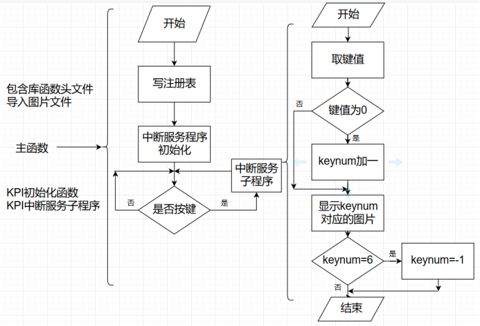 通过研究键盘扫描阵列实验的例程发现,可以使用KPI中断来实现功能。在上面的实验中,键盘键值的判断采用的是中断模式,需要程序打开键盘控制器中断,并设定优先级。在中断服务程序中,读取按键键值并点亮对应的LED灯。而在本实验中,将点亮LED灯的代码改为要求的功能即可。通过引入一个标志变量keynum来实现电子相册内照片的选择。按下“0”号按键时,进入中断服务子程序,keynum加一,并且通过switch语句选择显示对应的照片,当keynum即将超过照片总数时,将其置-1,下一次按键“0”时值即为0,显示第0张照片。 程序流程图如下: