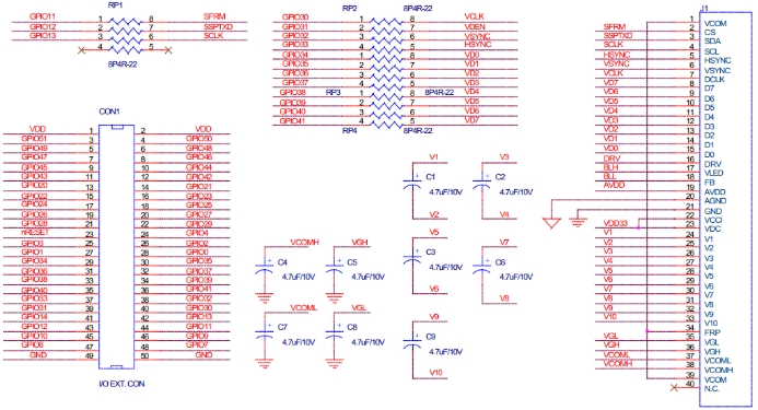 W90P710 评估板的LCD 控制器的主要目的是将VIDEO/OSD 的原始图像数据显示到外部液晶屏上。LCD控制器可以支持AUO的TFT屏,LG 的 TFT 屏,CASIO 的TFT 屏,实验中使用的是AUO 3.0" TFT A030DL01(960x240,8位数据总线)数字式TFT液晶屏。此外,LCD控制器还能够连接到STN LCD 和电视编码器上,并且支持VIDEO和OSD 两种显示模式。这两种显示模式的设定由不同的寄存器控制,通过设定相应寄存器的值可以实现不同的模式和功能。 AUO 3.0" TFT A030DL01 液晶屏由单个像素点排列组成,向这些像素点配置不同的值,可以显示不同的颜色。但是,由于AUO TFT液晶屏内部没有缓存,需要在SDRAM中开辟一片缓冲区存储一维数组形式的原始图像数据。然后,将存储原始图像数据的SDRAM 缓冲区的首地址赋值给LCD控制器中的FIFO1SDADR寄存器。接着,原始图像数据在时钟脉冲的作用下依次输入到LCD控制器的FIFO1中,直至FIFO1被填满才将FIFO1中的数据输出到LCD颜色发生器。最后,LCD颜色发生器将图像显示到评估板上的液晶屏中。如果在液晶屏上定位显示图片或其他信息,需要计算出所要显示的内容在液晶屏上的位置。然后,在新建的SDRAM缓冲区中存入需要显示的内容即可。LCD硬件连接图如图33所示。