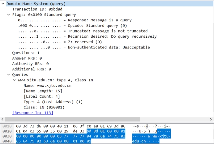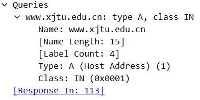 查询名字段:这里请求域名www.xjtu.edu.cn;查询类型字段:这里为A类型;查询类字段:这里为IN,表示互联网地址