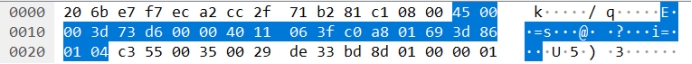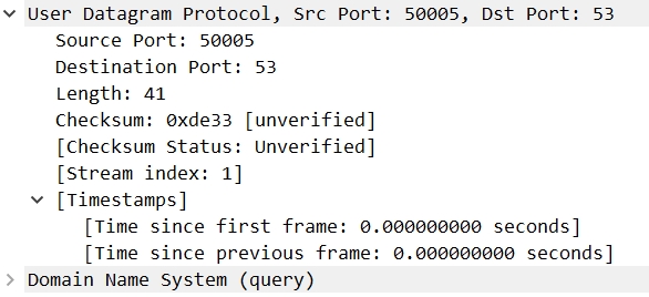 源端口为50005,是我自己电脑分配的端口;目的端口为53,是学校服务器的默认端口;数据报长度为41bytes;校验值为0xde33