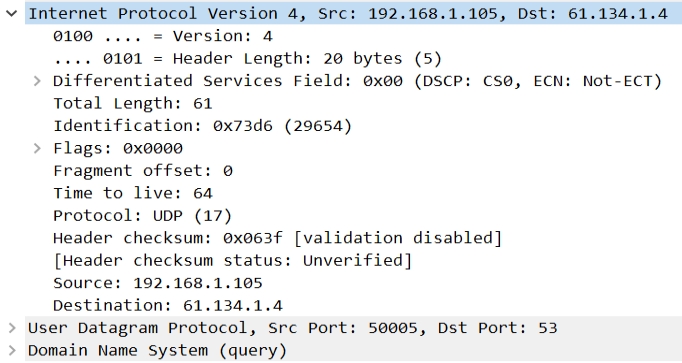 Version(版本):4(IPv4); Header Length(头长):20 bytes(5);服务类型:0x00,全部为正常;包裹总长:61bytes;重组标识:0x73d6;标志位:0000允许数据报分段,数据包后面没有包,该包为最后的包;段偏移量:0;生存时间:64;协议代码:UDP(17);头部校验和:0x063f;32位原始地址:192.168.1.105,这是我们宿舍局域网为我分配的IP地址;32位目的地址:61.134.1.4,这应该是局域网路由器的公网IP地址,经过查询,确实是陕西西安电信网的DNS服务器的IP地址。