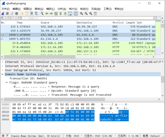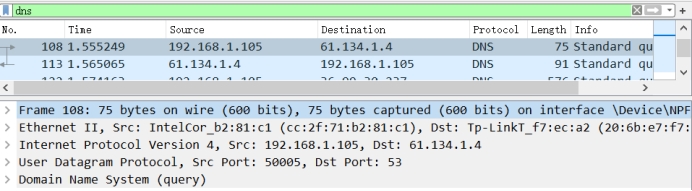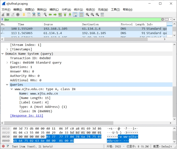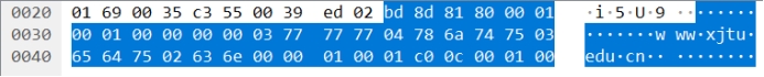 如第四部分所示,我们已经找到了有www.xjtu.edu.cn内容的DNS单元,它是一个请求过程中产生的DNS协议单元。