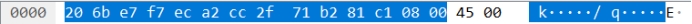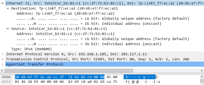 目的MAC地址:Tp-LinkT_f7:ec:a2 (20:6b:e7:f7:ec:a2)这是我们宿舍路由器的MAC地址,前面有普联公司特有的MAC字段:20:6b:e7;原MAC地址:IntelCor b2:81:c1(cc:2f:71:b2:81:c1),这是我电脑的MAC地址,前面有英特尔酷睿的特有字段:cc:2f:71。