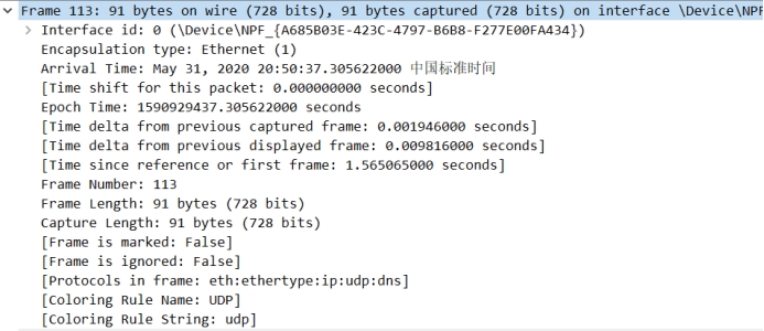 里面主要是接口ID、封装形式、到达时间、纪元时间、帧编号(113)、帧长(91bytes)、捕获长度(91bytes)、框架内的协议等等信息。