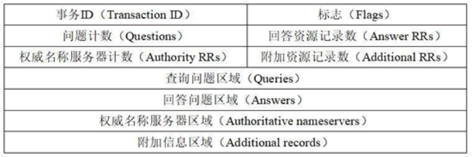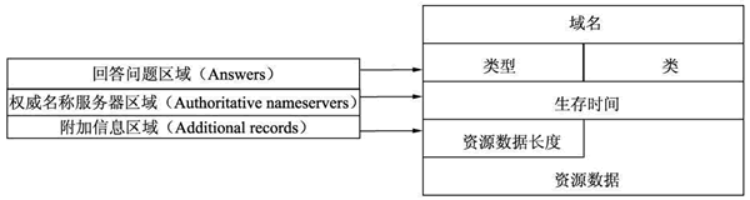 资源记录部分:资源记录部分是指 DNS 报文格式中的最后三个字段,包括回答问题区域字段、权威名称服务器区域字段、附加信息区域字段。这三个字段均采用一种称为资源记录的格式,格式如图所示。