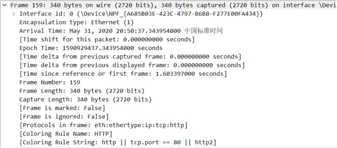 里面主要是接口ID、封装形式、到达时间、纪元时间、帧编号(159)、帧长(340bytes)、捕获长度(340bytes)、框架内的协议等等信息。