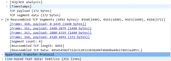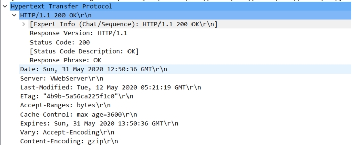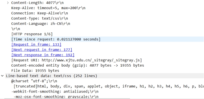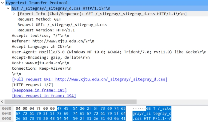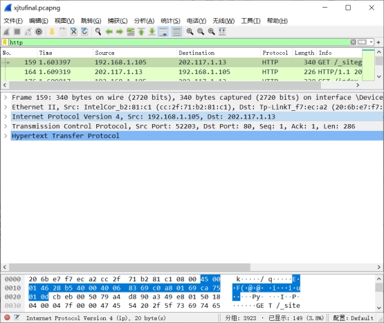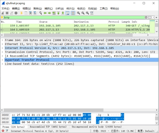 如第四部分所示,我们已经找到了源地址为202.117.1.13的HTTP单元,它是一个响应过程中产生的HTTP数据单元。 它每一层遵循的协议如下: 应用层:HTTP——请求-响应协议 传输层:TCP——传输控制协议 网络层:IPv4——网际协议版本4 数据链路层:Ethernet II——以太网协议 ① 数据包情况: