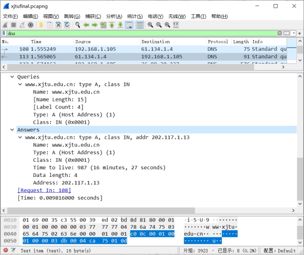 查询名字段:这里请求域名www.xjtu.edu.cn;查询类型字段:这里为A类型;查询类字段:这里为IN,表示互联网地址;生存时间:987(16min27s);数据长度:4;资源数据(返回的地址):202.117.1.13。