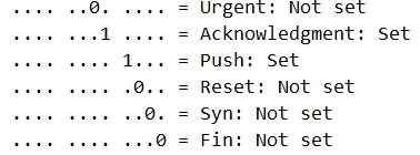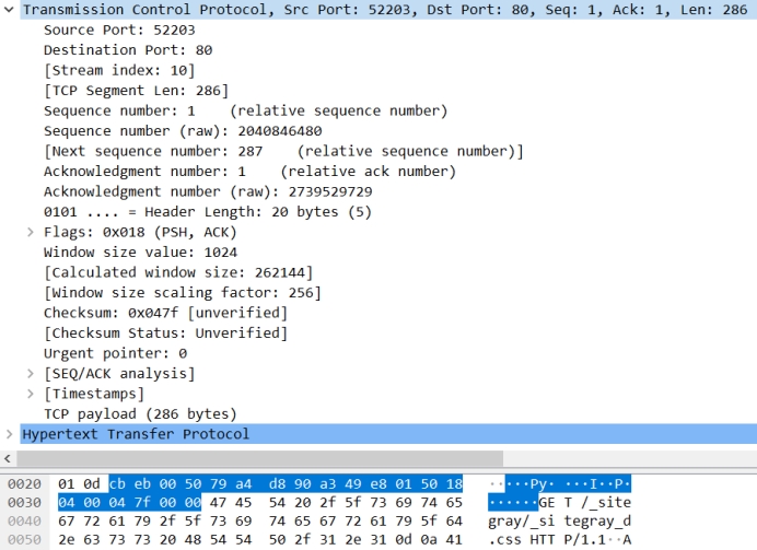 源始端口:52203(本机端口);目的端口:80(TCP协议默认端口);数据序号:1;确认序号:1;偏移(头部字节数):20bytes;保留部分:0;U、A、P、R、S、F:0 1 1 0 0 0(紧急指针字段无效,确认号字段有效,上交数据,复位字段无效,同步字段无效,中止字段无效);窗口字段:1024(对应的窗口大小为262144);包校验和:0x047f;紧急指针:0。