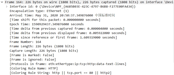 里面主要是接口ID、封装形式、到达时间、纪元时间、帧编号(164)、帧长(226bytes)、捕获长度(226bytes)、框架内的协议等等信息。