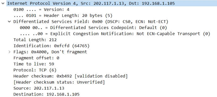 Version(版本):4(IPv4); Header Length(头长):20 bytes(5);服务类型:0x00,全部为正常;包裹总长:212bytes;重组标识:0xfcfd;标志位:4000禁止数据报分段,数据包后面没有包,该包为最后的包;段偏移量:0;生存时间:59;协议代码:TCP(6);头部校验和:0xb492;32位原始地址:202.117.1.13,这是学校服务器的IP地址;32位目的地址:192.168.1.105,这是我们宿舍局域网为我分配的IP地址。