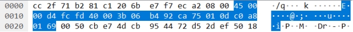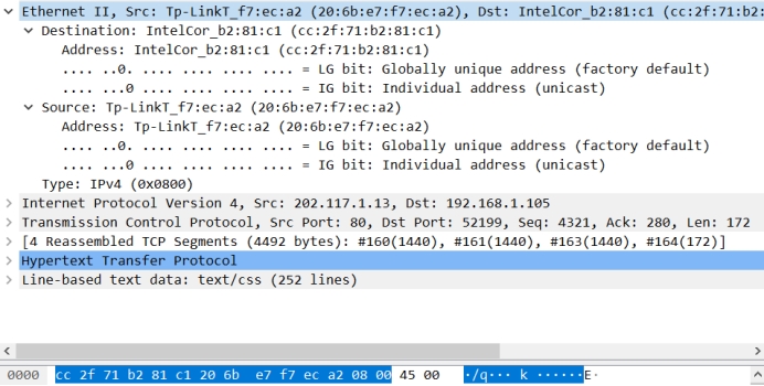 目的MAC地址:IntelCor b2:81:c1(cc:2f:71:b2:81:c1),这是我电脑的MAC地址,前面有英特尔酷睿的特有字段:cc:2f:71;原MAC地址:Tp-LinkT_f7:ec:a2 (20:6b:e7:f7:ec:a2)这是我们宿舍路由器的MAC地址,前面有普联公司特有的MAC字段:20:6b:e7。