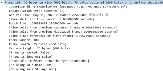 里面主要是接口ID、封装形式、到达时间、纪元时间、帧编号(108)、帧长(75bytes)、捕获长度(75bytes)、框架内的协议等等信息。