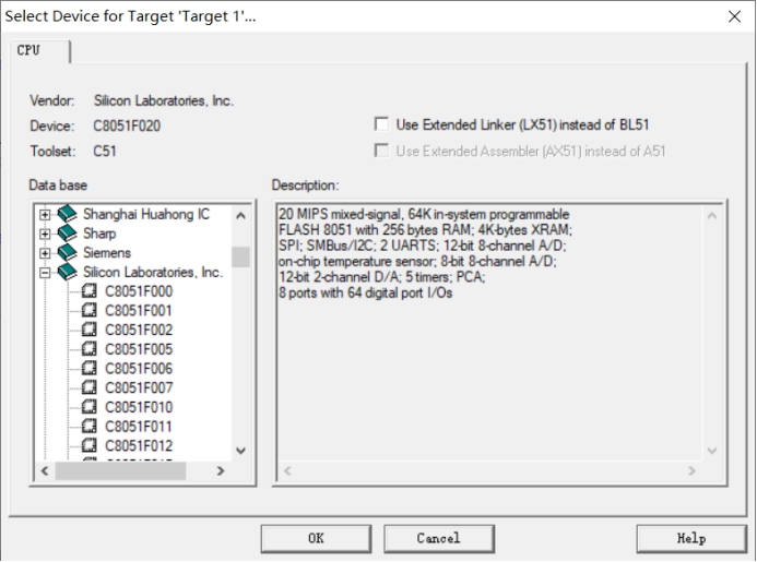 关于查看使用单片机型号的问题,我经过学习了解到,应该Project-> Select Device for Target即可查看单片机型号。在例程中查看发现该单片机在Silicon Laboratories.Inc.下面。选择C8051F020单片机芯片即可完成工程的初始创建。