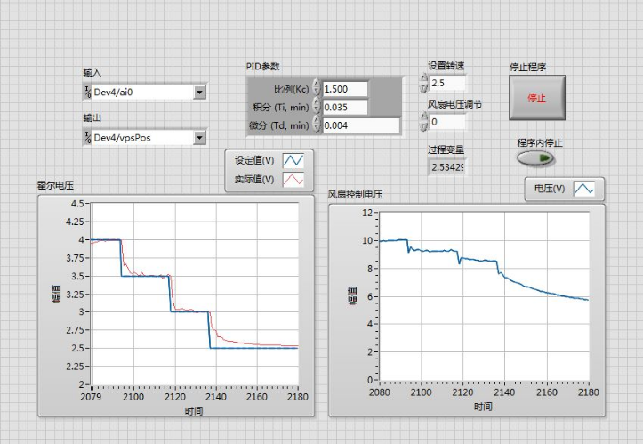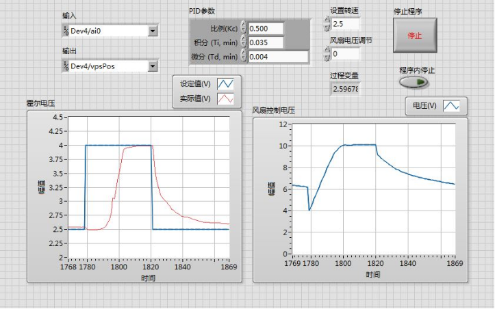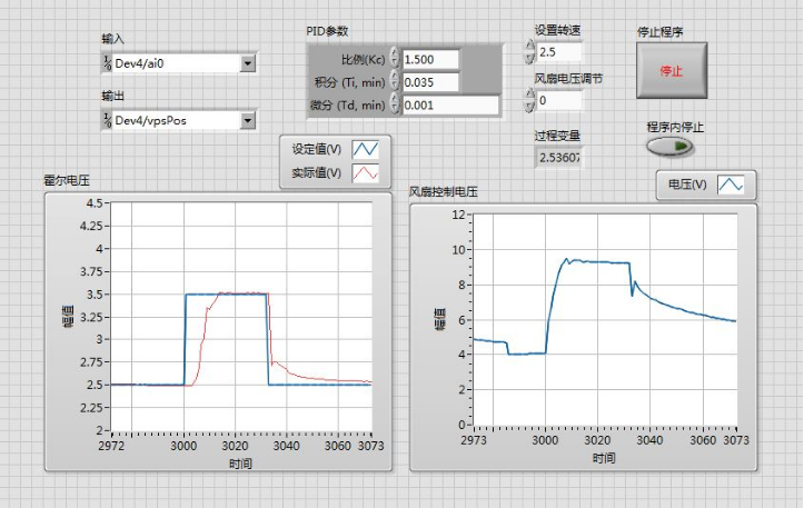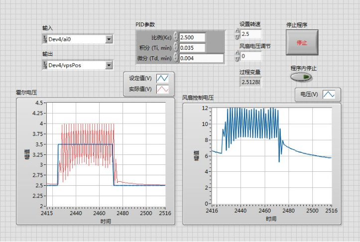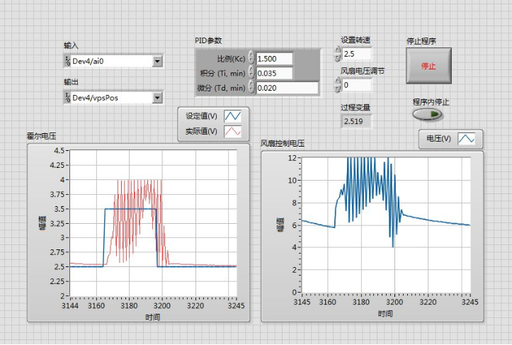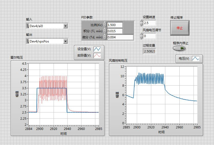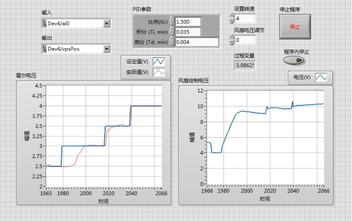 图2 Kc=1.5, Ti=0.035,Td=0.004霍尔电压上升时变化曲线