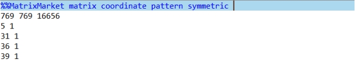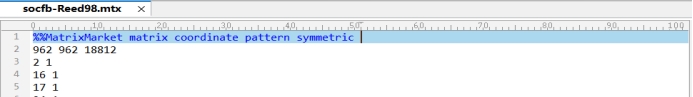 其中遇到一点点小问题,导入时报错:文件不是以MatrixMarket matrix格式存储的,导入失败,后来我用UltraEdit软件打开才发现,本来MatrixMarket matrix格式第一行应该有两个“%”才能被识别,但是数据集只有一个“%”,将其更改完毕即可成功导入。下面几行就是网络规模、边数和邻接关系。