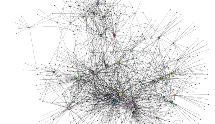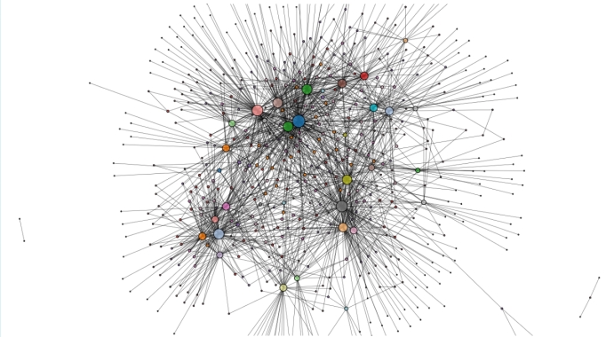 仅用一个数据集不足以证明检测算法的鲁棒性,我在同一个网站上下载了另一个规模相近的网络数据集Reed98进行测试,其网络拓扑图如下,其中节点数为962,边数为18.8k,规模比上一个网络大了一些,计算时间也相应长了一些。