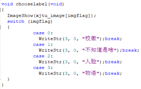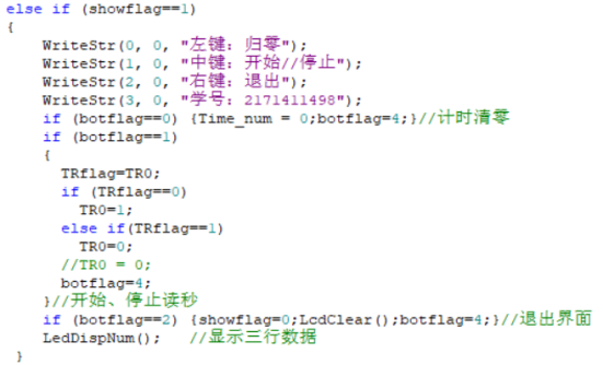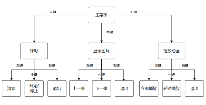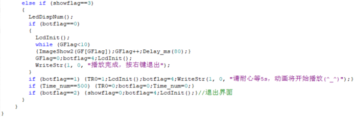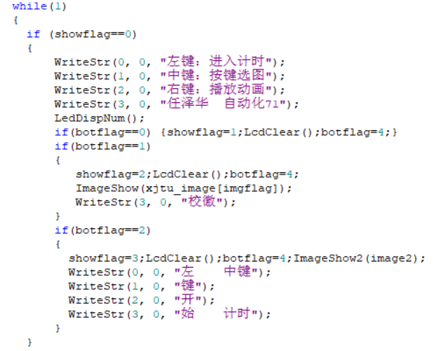 主要思想就是全局变量flag的使用以实现菜单功能。 主要标志变量有:botflag(按键标志)、TRflag(计时标志)、showflag(页面标志)、imgflag(图片标志)、GFlag(动画标志) 使用if语句对页面标志showflag进行选择,显示对应的页面,实现不同的功能。在每个条件语句内加入了对按键标志botflag的判断,若检测到有按键操作,将对应的标志变量改变,botflag置4,并进行相应的操作(清屏、显示提示信息等等)。 下一次循环时由于标志变量的改变,直接进入对应页面。