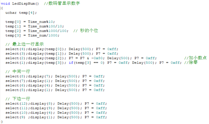 P5和P6是LED的选通信号,P7是LED显示数字的控制信号。LED的显示是基于“刷新”的,也就是几个LED单元轮流显示,在周期很短的时候肉眼就看不出来闪烁。所以LED刷新函数必须放在主循环里面才能实现LED数字的显示。