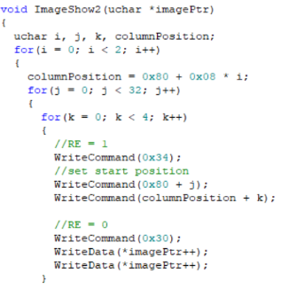其中第一个是向lcd指定行、指定列写入字符串,值得注意的是,中文字符串占用了两个英文字串的位置,若是中文混着英文,中间的英文字符必须为偶数(可以用空格占位),否则后面的中文字符会有乱码。而且中文字符中有些lcd字库中没有的也会乱码,可以替换为其他字符。 第二个函数是在lcd上显示一幅图片,它和字符的显示相互独立,如果不注意二者可能会重叠。其中主要有三层循环,第一层循环两次,分别控制屏幕的上半部分和下半部分;第二层循环有32次,是显示屏的列控制;第三层循环有8次,是显示屏的行控制。根据显示原理可以将例程中的右半屏显示改为全屏显示,也可以改为上半屏显示。