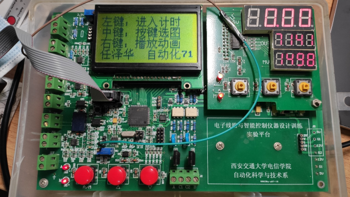 由于上学期实验项目是单片机延时播放动画的程序,这学期在这个基础上添加了计时、按键选图功能,并添加了操作界面。上学期的动画一共有上千帧,单片机存储空间有限,不能存放下这么多的内容,在Proteus中使用了SD卡模块,这学期在实际接触到板子以后发现外接SD卡不太可能,所以选取了一个10帧的动画来展示。 1、有一个主菜单,包括各种功能选择和班级姓名的显示。 2、点击左键进入计时功能模块,其中左键为清零、中键为开始/停止计时、右键为退出。Led数码管第一行显示计时结果,后两行定义为学号后8位,lcd屏显示按键功能和学号。 3、点击中键进入显示图片模块,其中左键为上一张,中键为下一张,右键为退出,对应的lcd显示屏上面左屏为图像说明和按键说明,右屏为图片。一共四张。 4、点击右键进入动画播放模块,其中左键为立即播放,中键为延时5秒后播放,右键为退出。延时时,lcd显示请等待提示,播放完动画后显示右键退出提示。
