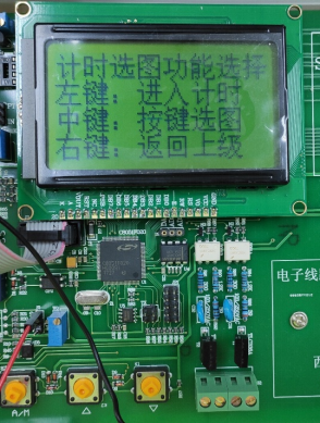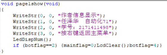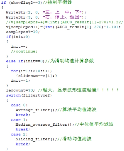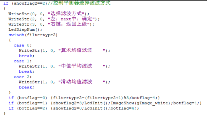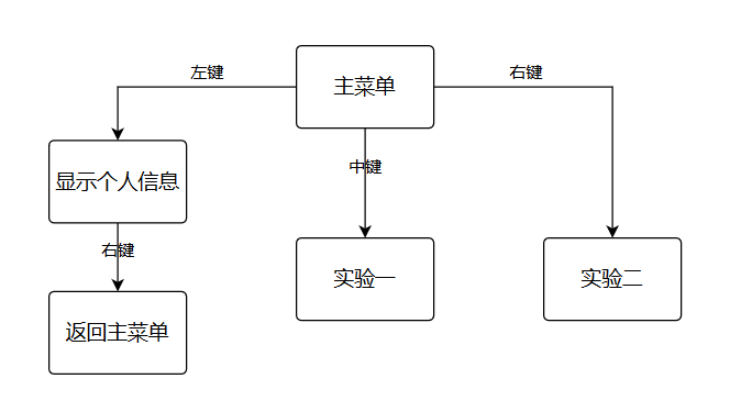 重新编辑了主菜单,为了配合按键显示,将实验一的功能一和功能二合成了一个子功能。加入了显示个人信息界面和实验二的显示波形、控制飞行器子功能。 1.主菜单包括三个选项:显示个人信息(左键)、进入实验一功能(中键)、进入实验二功能(右键)。其中显示个人信息界面下显示姓名学号班级等等信息,按右键退出。 2.实验一子菜单内是实验一实现的功能,在此不再赘述。值得一提的是,由于实验一有三个功能,缺一个返回按钮,所以我把计时和播动画两个功能进行了合并,变为一个“计时选图”选项,并创建了一个过度菜单来选择,将右键统一设置为返回按钮。 3.实验二子菜单有三个选项:显示波形(左键)、控制平衡器(中键)、返回主菜单(右键)。 4.显示波形子功能中选中进入过渡菜单,按左键进入播放,中键播放下一个,右键返回。一共有三种波形:正弦波、三角波、方波。进入以后再按左键重新播放这一个波形。 5.控制平衡器功能选中进入选择滤波方式过渡菜单。其中左键选择下一个,右键退出。一共有三种滤波方式:算数均值滤波、中值平均滤波、滑动均值滤波。按中键确定进入,按右键退出。进入显示波形界面后,上半屏显示霍尔传感器实时检测的电压曲线,下半屏是提示信息,左键为飞行器向上,中键为飞行器向下,右键为返回停止。