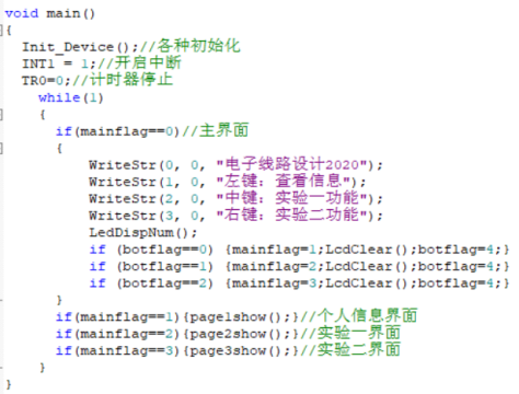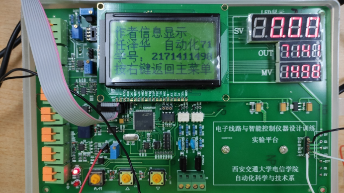 编程实现平衡器控制系统功能调试。要求采用基于C8051F020智能控制器作为平衡器控制系统的核心部件,编程实现对平衡器的自动控制。要求程序中必须包含数码管、液晶显示、键盘、AD。 将实验任务一和任务二的功能整合成一个大工程,LCD屏上显示主菜单:包括三个子菜单 (1)个人信息 ; (2)实验一功能; (3)实验二功能:LCD屏上显示控制电压曲线、LED显示控制电压值。 自己编写PID算法并实现PID参数的整定,能够保证控制的稳定性和快速性。
