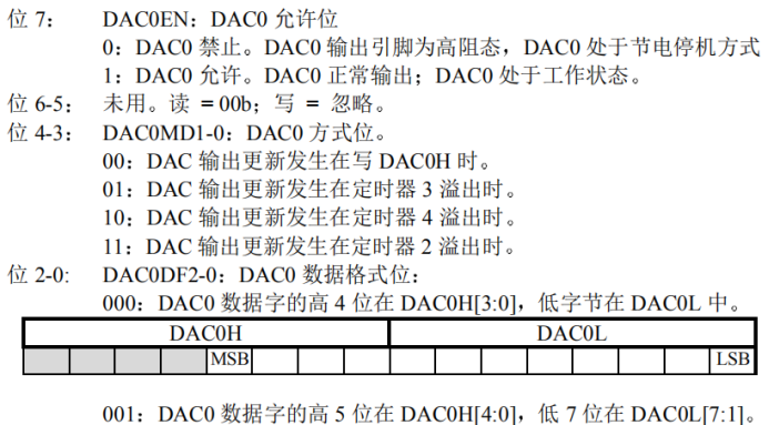 刚开始我在按照例程写完DAC输出时发现并没有对电机起到控制作用,在仔细查看操作手册以后我发现这和DAC初始化时向DAC0CN写入的控制字有关。两个例程中写入的控制字不同,一个是0x98(10011000),另一个是0x94(10010100)。