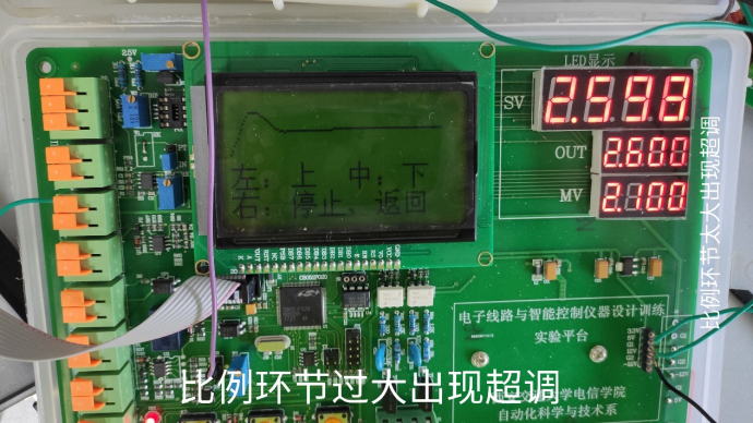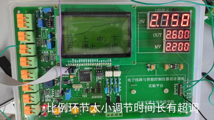 按照方法中的指示,先从比例环境调起,可以很明显地看出,比例环节过小,调节时间太长且具有静差;但是比例环节太大以后,出现了较大的超调,比较合适的时调节出理想的4:1衰减曲线。