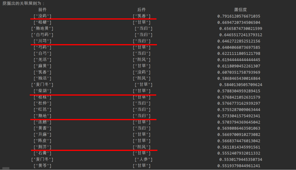 中医药的理论博大精深,各种药材之间的配合在治病的疗效上会起到1+1>2的效果。比如茯苓和人参搭配,具有益心力,除谬忘,能饮食,延年益寿之功效。主治上气,胸胁满闷,霍乱,积痢。其他的相似组合还有很多,进行关联规则的发现可以帮助我们更系统地归纳古人留下的药方中的知识,便于将中医药应用于现代疾病的治疗中。