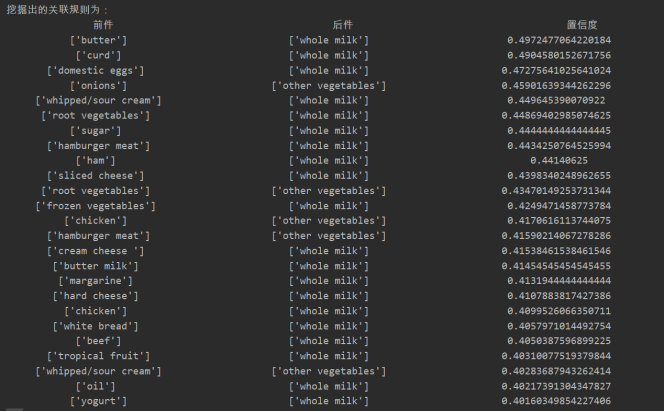 支持度、置信度均为0.01时前25项挖掘出的关联规则