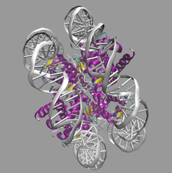 核小体由DNA和蛋白质构成,其中DNA围绕在蛋白质的外围。DNA双链结构经过进一步盘曲折叠,形成螺旋状的二级结构,盘曲旋转形成一个中空的管道。DNA链内部是蛋白质分子,其主要结构为α螺旋,几个蛋白质亚基填充其中,起到支撑、维持核小体结构的作用。