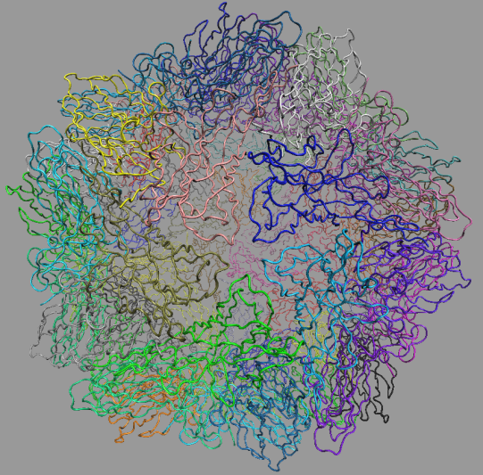 猪圆环病毒衣壳呈现正十二面体的结构,其中每个蛋白质亚基结构相同,在空间上形成了完全对称的结构,它内部包裹着病毒的遗传物质进行传播。