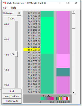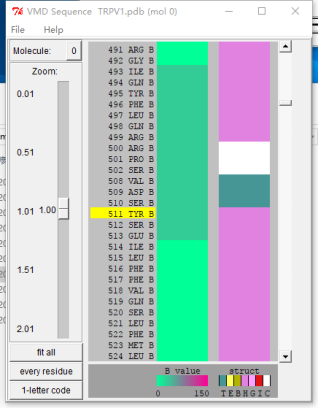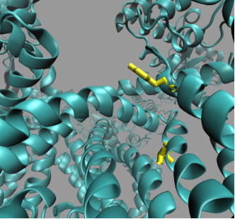 使用标记法标出TRPV1的511和550号位点的突变,使用与原始蛋白不同的表示,用不同的对比和视角分别展示。 辣椒素受体的突变位点在蛋白质结构的内部,使用更近一些的视角可以看出,辣椒素受体的突变位点位于α螺旋的末端,这一点对我们的研究也有一定的启示。