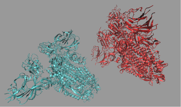 调节为大致为相同的角度,可以看出二者的结构大致相同,不同的是SARS左上角的β折叠结构比较小而2019 n-Cov的这部分结构比较大。