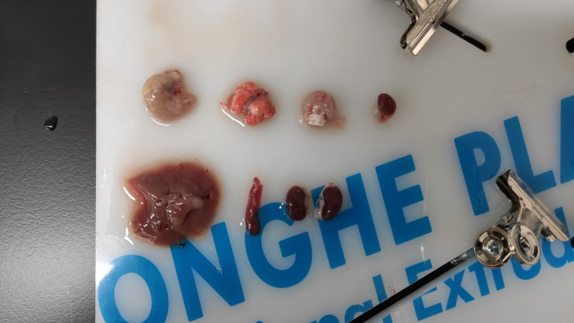 脏器的观察 将取出的脏器用纯水涮洗,放置在生理盐水中浸泡,并放于冰块中,最后全部取出观察拍照